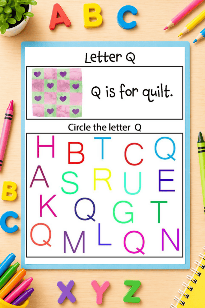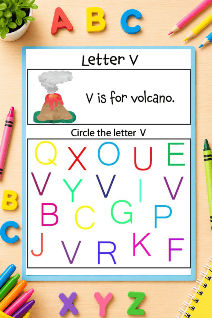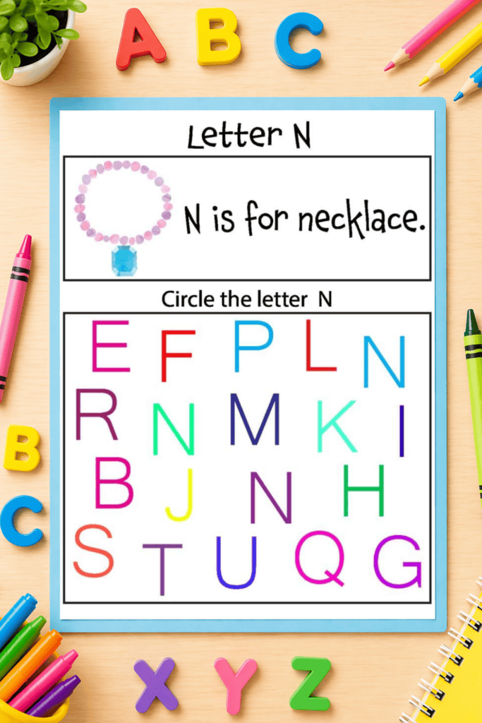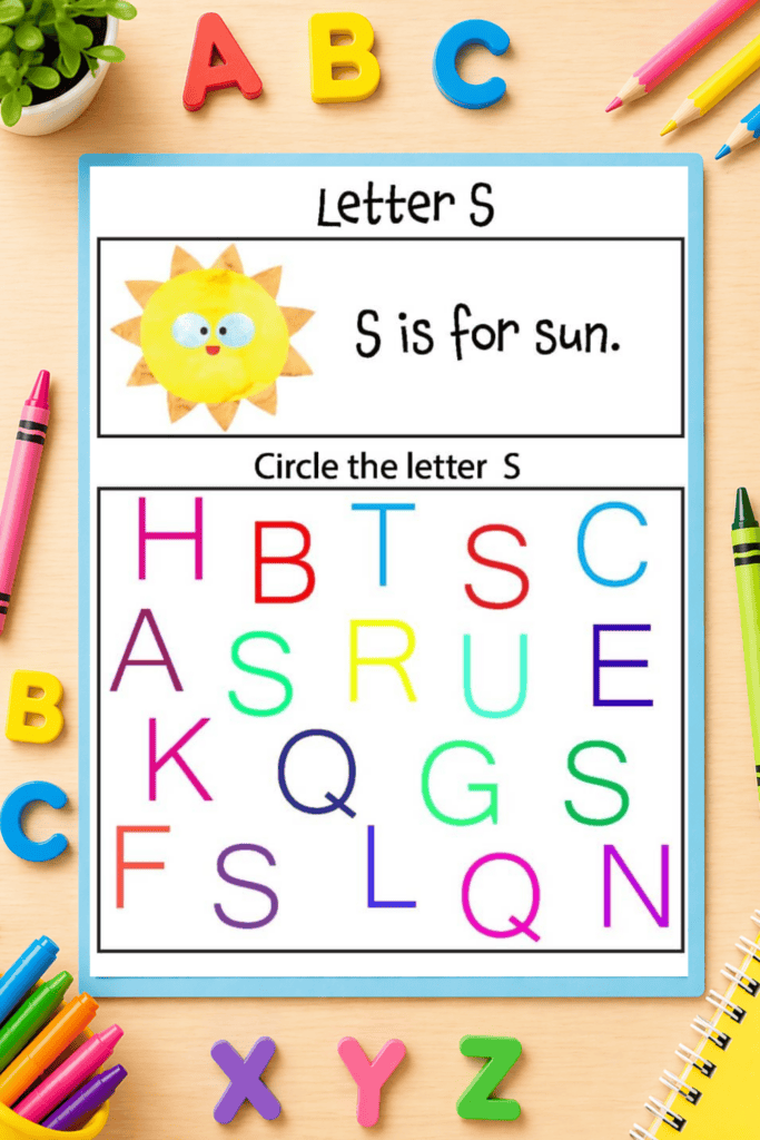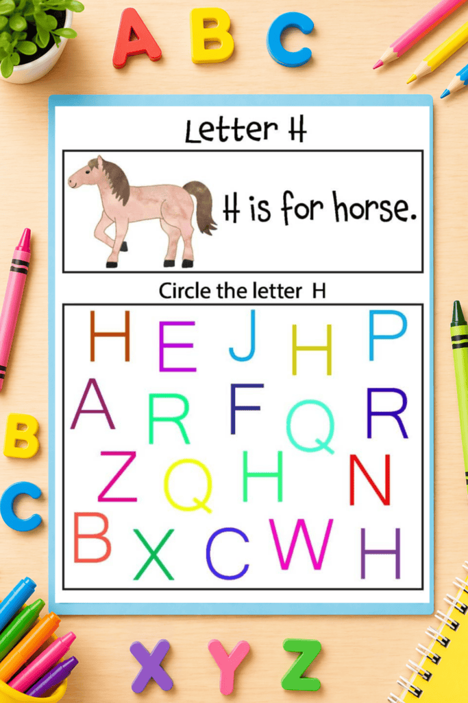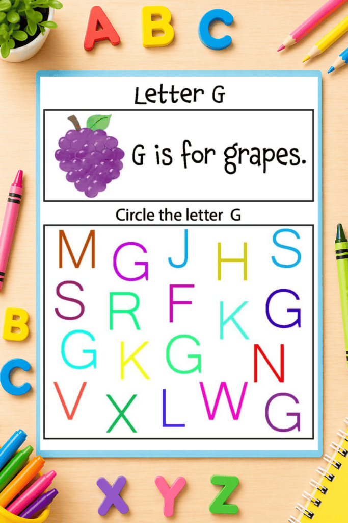 - A letter identification activity where kids circle the correct letter among a mix of others