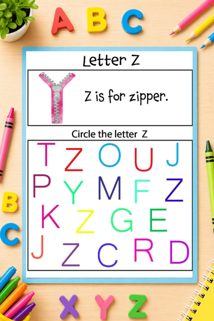 This set includes 26 printable worksheets (A–Z). Each page features: